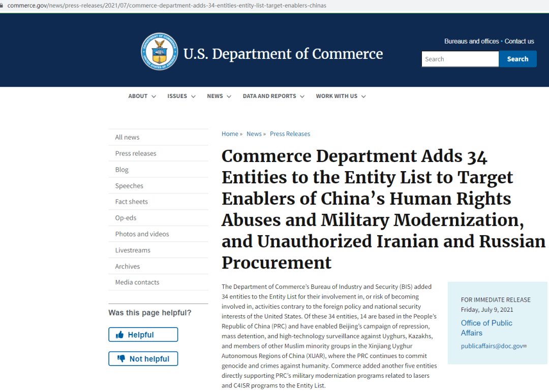 ERC認(rèn)定以下實(shí)體與所謂“中國在新疆的侵犯人權(quán)行動”有牽連,違反美國外交政策,將其列入“實(shí)體清單”。
