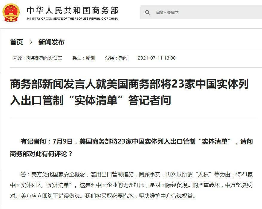7月9日,商務(wù)部新聞發(fā)言人就美國商務(wù)部將23家中國實(shí)體列入出口管制“實(shí)體清單”答記者問:美方泛化國家安全概念,濫用出口管制措施,罔顧事實(shí),再次以所謂“人權(quán)”等為由,將23家中國實(shí)體列入“實(shí)體清單”。這是對中國企業(yè)的無理打壓,是對國際經(jīng)貿(mào)規(guī)則的嚴(yán)重破壞,中方堅(jiān)決反對。美方應(yīng)立即糾正錯誤做法。我們將采取必要措施,堅(jiān)決維護(hù)中方合法權(quán)益。