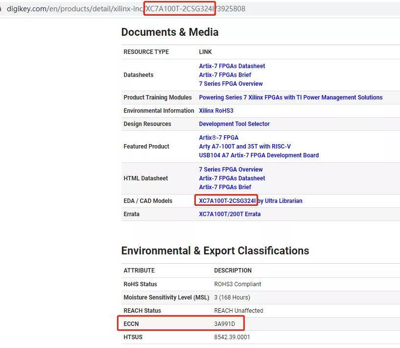型號:XC7A100T-2CSG324I,品牌:賽靈思(Xilinx)的ECCN是“3A991D”,表示“可以出口到中國”。